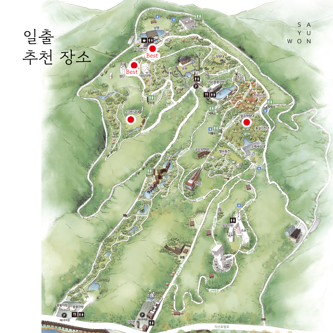 사유원에서 추천한 일출 장소와 정원 코스 안내도입니다. 전체를 도는데 여유롭게 3시간 이상은 가뿐히 소요되는 것 같습니다. 겨울철이라 길이 미끄러워 더 오래걸릴 수도 있으니 시간을 넉넉히 잡고 방문하는 것을 추천드립니다.